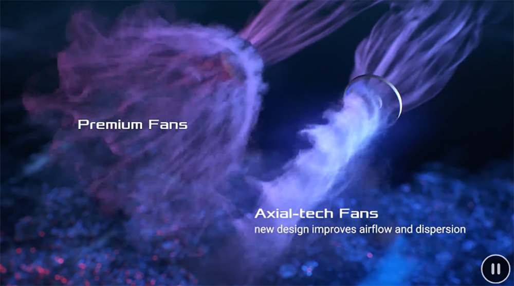 Özenle tasarlanmış ön koruma, soğutma bloğu ve ısı borusu düzeni, eksen teknolojili iki fanın kasanın yan panel havalandırmasından yararlanmasını ve kartın içinde gizlenen termal performansın açığa çıkmasını sağlar.