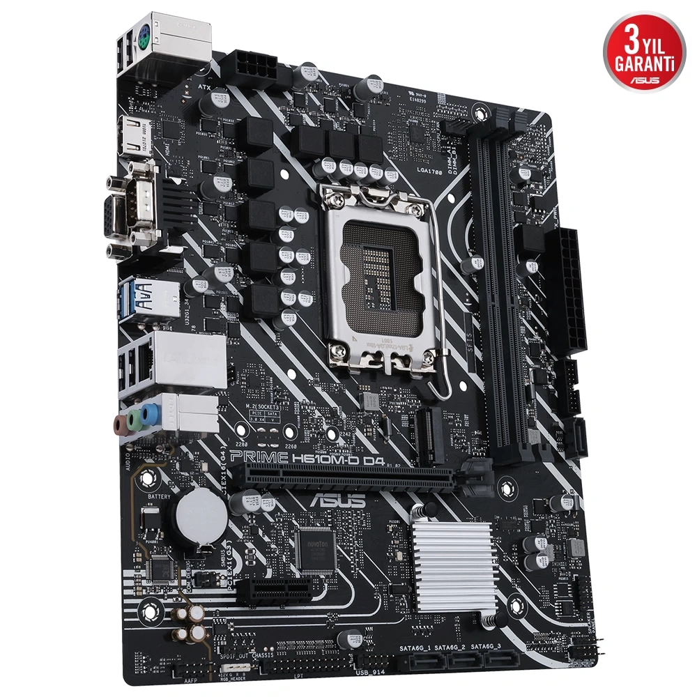 Intel® H610 (LGA 1700) mic-ATX anakart. DDR4, PCIe 4.0, M.2 yuvası, Realtek 1 Gb Ethernet, HDMI®, D-Sub, USB 3.2 Gen 1 bağlantı noktaları, SATA 6 Gbps, COM başlığı, LPT başlığı, RGB başlığı