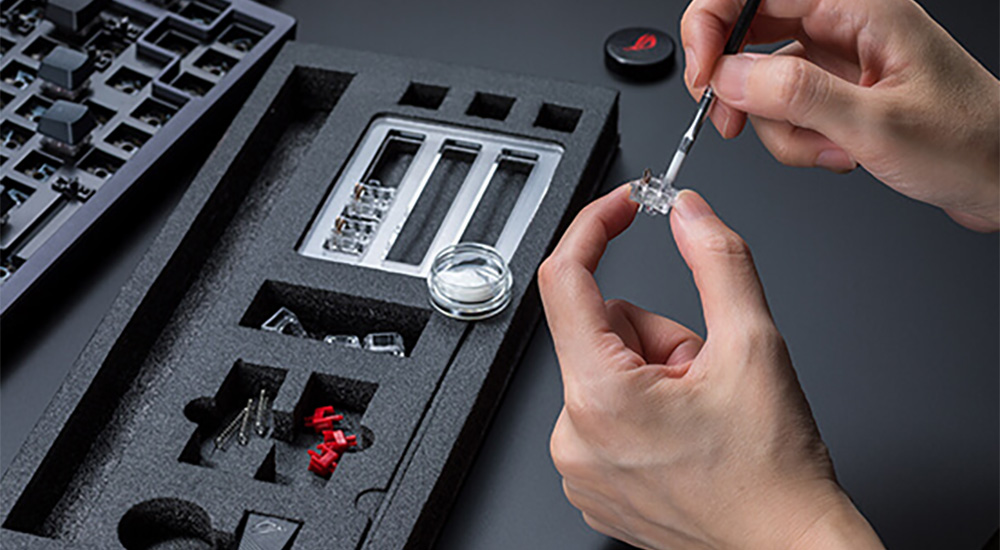 ROG Azoth, anahtarları kendi başınıza yağlayabilmeniz için bir dizi alet sunuyor. Bu kit; anahtar açıcı, tuş başlığı sökme aleti, anahtar sökme aleti, yağlama istasyonu, fırça ve Krytox™ GPL-205-GD0 yağ içerir.