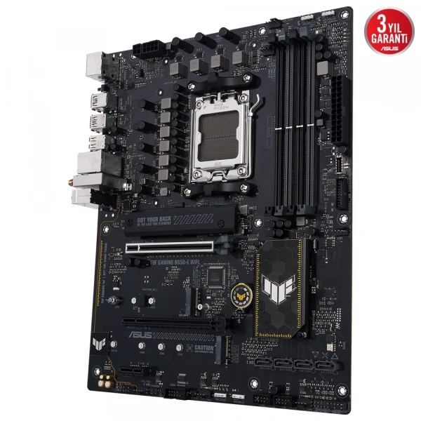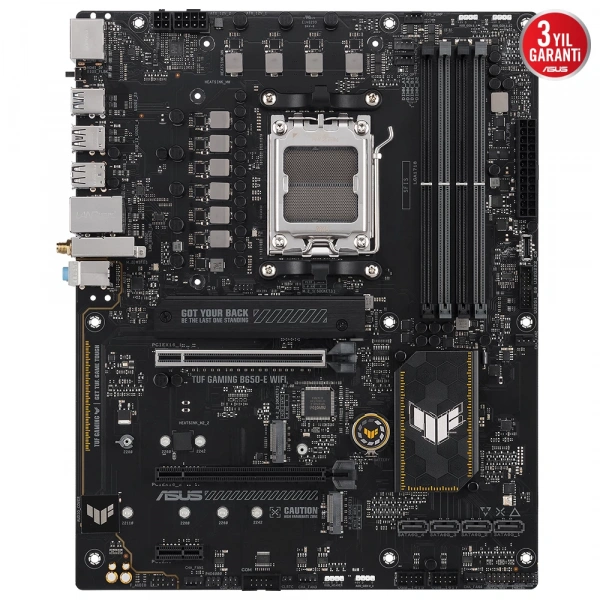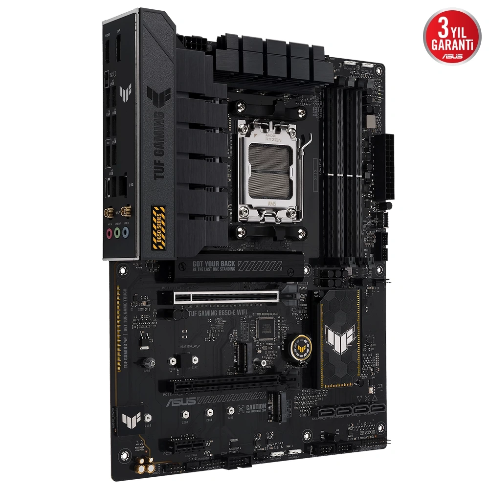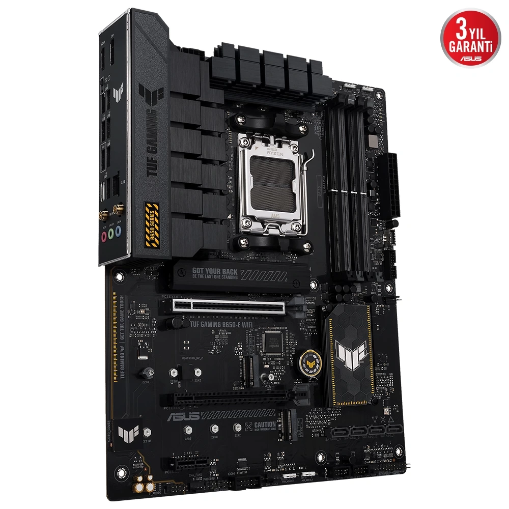 ASUS TUF GAMING B650-E WIFI, AMD Ryzen™ işlemciler için yeni AM5 Soketin en önemli unsurlarını alıp oyunlara yönelik özellikler ve kanıtlanmış dayanıklılıkla bir araya getirir. Askeri sınıf bileşenler, gelişmiş güç çözümü ve kapsamlı soğutma sistemiyle donatılan bu anakart, oyun maratonları için kararlı ve sağlam performans ile beklentilerin ötesine geçer. TUF GAMING anakartlar, diğerlerinin başarısız olabileceği koşullarla başa çıkabileceklerini garantilemek için zorlu testlerden geçirilir. Bu model estetik bakımdan, TUF GAMING serisini tanımlayan güvenilirliği ve kararlılığı yansıtmak için sağlam siyah rengi ve geometrik tasarım öğelerini bir araya getirir.