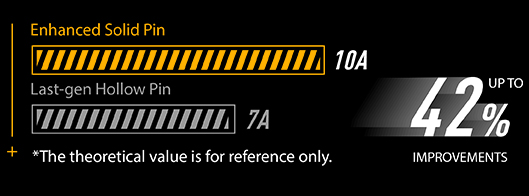 ASUS ProCool bağlantıları, PSU güç hatlarıyla temas sağlamak için geleneksel güç girişlerine kıyasla çok daha sıkı teknik özelliklere uyacak şekilde geliştirildi. Öz direnci düşüren bu özellik sayesinde sıcak noktaların oluşması ve bağlantı noktası hataları engellenir.